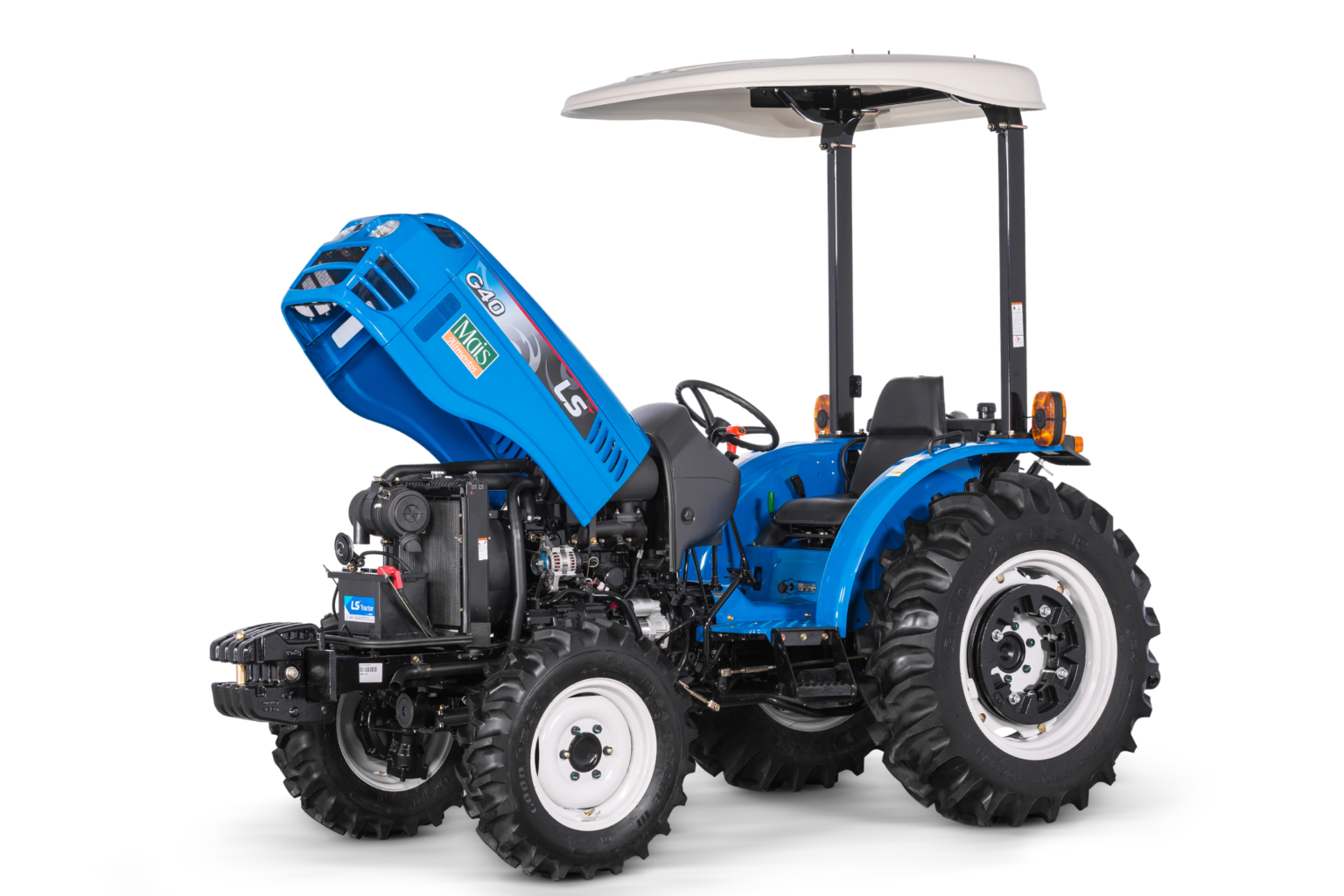 Trator agrícola LS Tractor modelo Plus 80, tração 4×4, motor Perkins diesel 4 cilindros Turbo alimentado tecnologia Mar1/Tier3, com potência 82 cv.